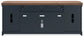 This TV stand combines casual contemporary design with modern appeal. Its combination of a thick-bodied wood-tone top with a slate blue cabinet is a smart choice on so many levels. Stow away electronics in the roomy cabinets, and use the upper shelf to conceal a soundbar speaker for a clean integrated look. Enhancing the experience: the optional fireplace insert (sold separately) brings a touch of warmth and beautiful ambiance to your living room.